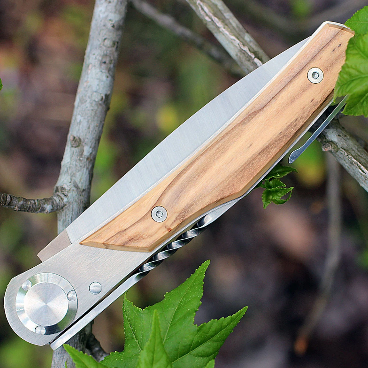 4 3/8″ closed. 3 1/8″ X50CrMoV15N stainless blade with cryogenic quenching. Unique double cone locking system automatically compensates for any possible blade play. The central pivot uses a special screw-nut. The large bearing surfaces of the flanges guarantee a perfect guidance and a long life for the action of the knife. Olive wood handles. Slim profile pocket clip. Metal storage tin.