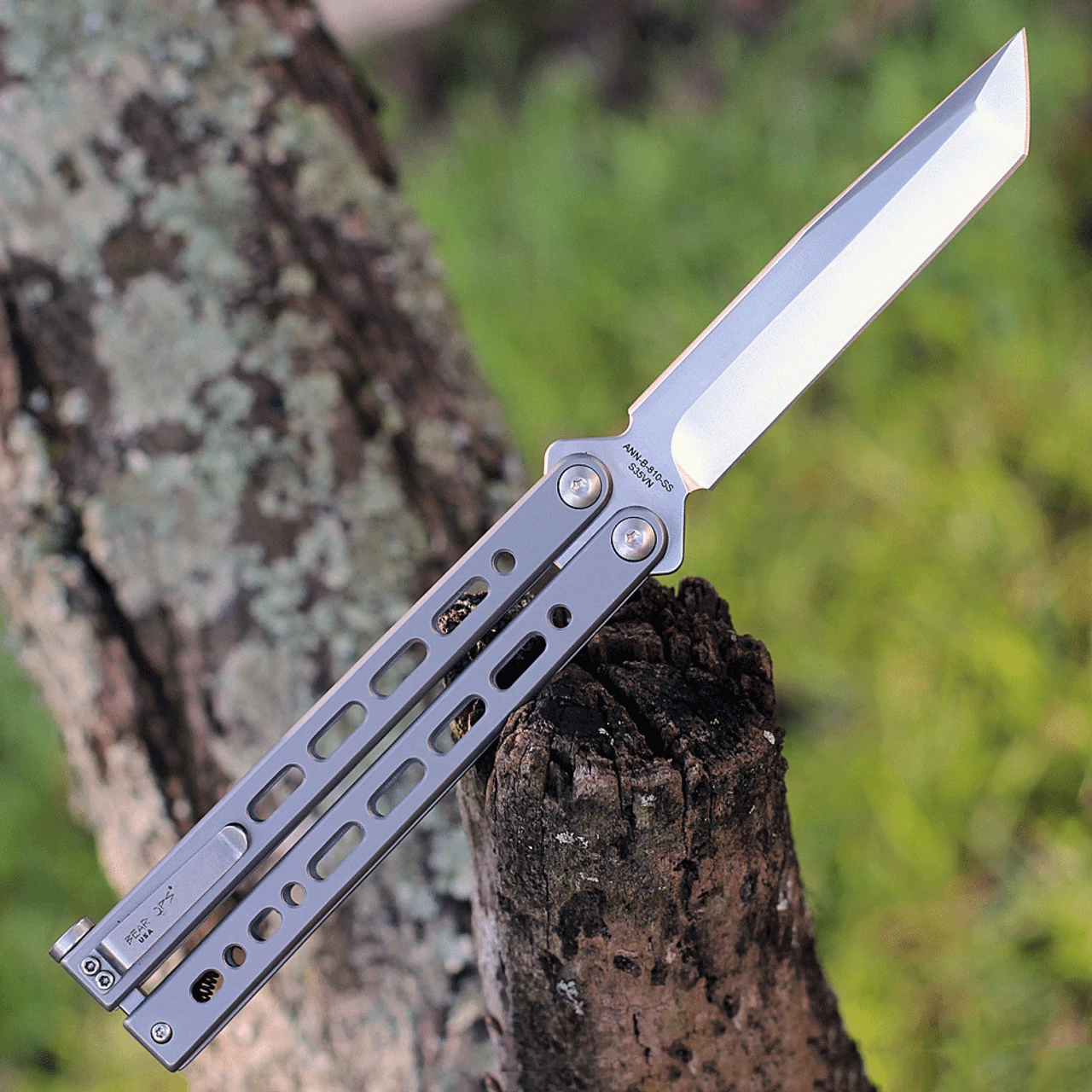 Bear & Son Cutlery 30th Anniversary Butterfly Knife – 4.9″ CPM-S35VN SS Embellished Satin Tanto Blade, Cerakote SS Handle – ANNB-810-SS-S35
