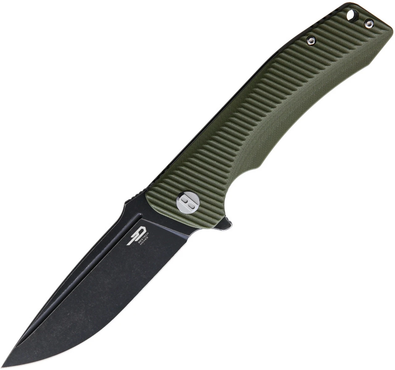 Bestech Mako BG27D Flipper Knife, 3.74″ D2 Black Stonewashed Drop Point Blade, Milled OD Green G-10 Handle