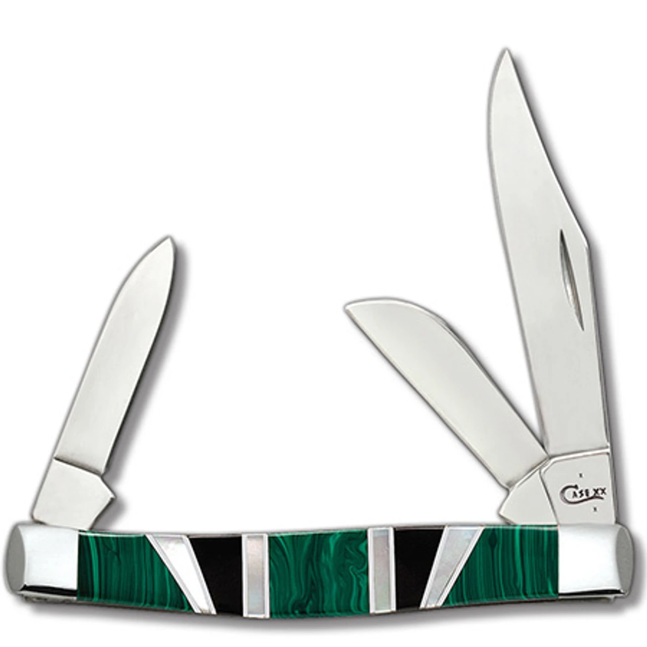 Could a Case® knife really make you green with envy? The latest exotic family from W.R. Case & Sons Cutlery Company just might. Green Malachite, with its characteristic vibrant two-tone green color carrying light green streaks, joins genuine Mother-of-Pearl and Jet Black Pearl creating a simply stunning handle. Tru-Sharp™ surgical steel blades and nickel silver spacers add luster, while a velvet box completes this presentation.