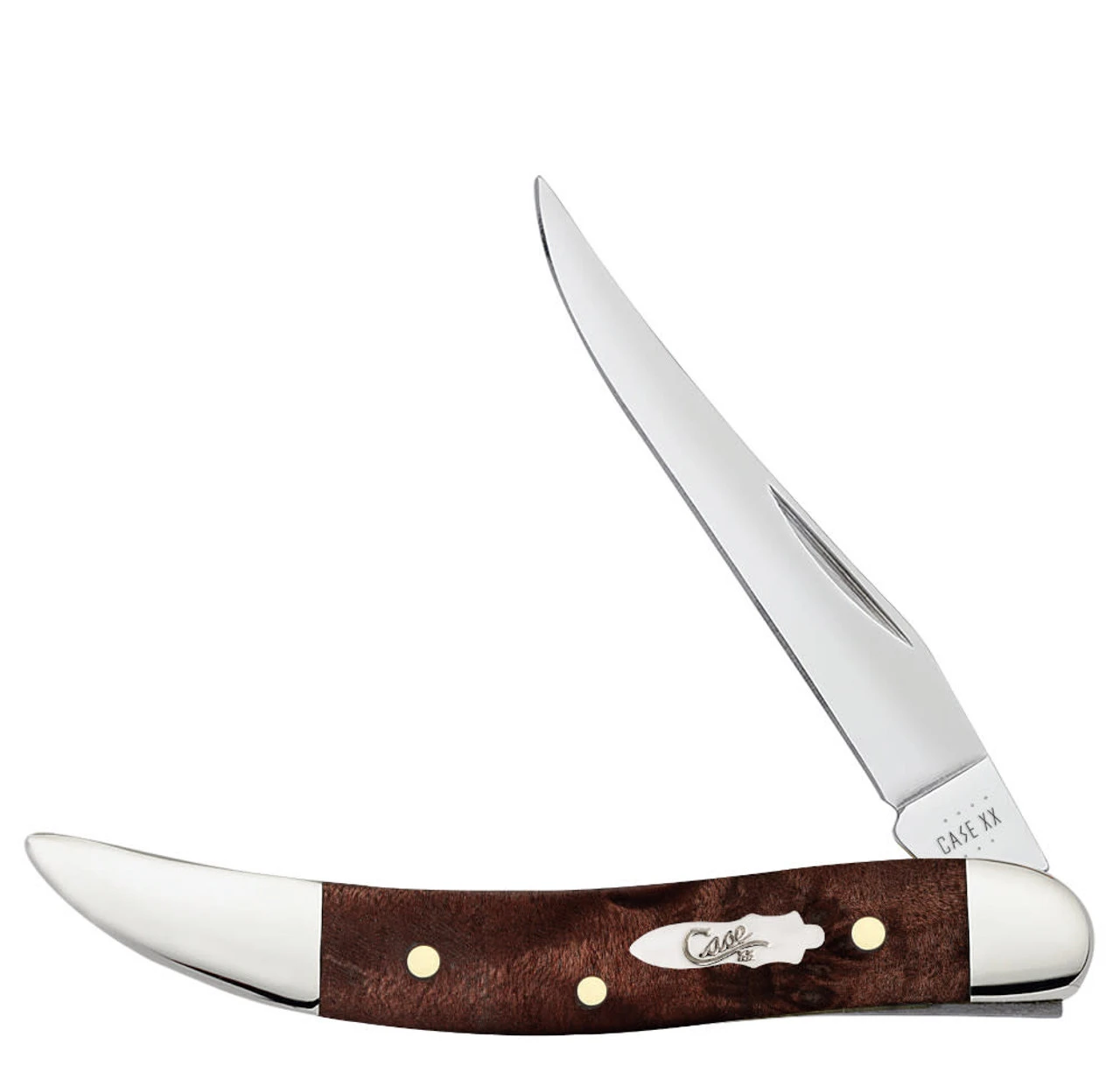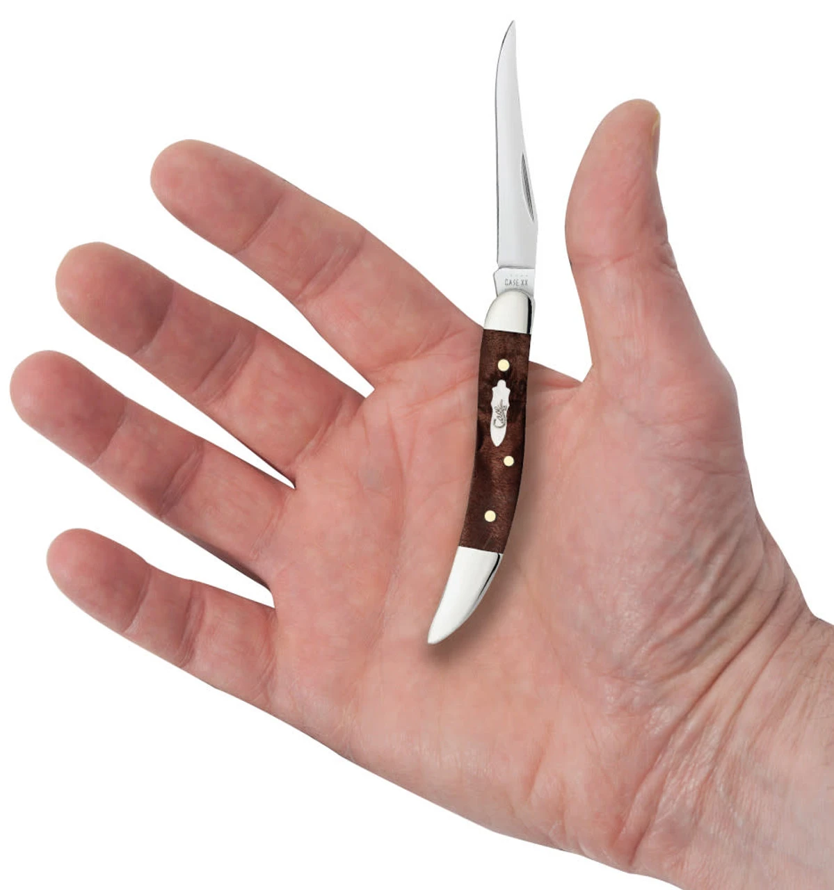 Combined with a mirror-polished Tru-Sharp surgical steel blade the Case Brown Maple Burl Wood handle is as good looking as it is functional. The sleek Case bomb shield accent and deep grain of the wood present a pretty package that nevertheless mean business when it comes to completing daily cutting chores. Smaller version of the Medium Texas Toothpick, features a Long Clip blade and has a small design that fits well into pockets or purses. The Clip blade is commonly used as a multi-purpose blade and preferred for detail work. This knife is constructed with Case Tru-Sharp™ stainless steel which is a special high-carbon steel that helps the blades hold an edge longer than conventional steel. It also offers extraordinary blade strength and corrosion resistance. Comes conveniently packaged in a box. Made in Bradford, PA, USA from domestic and imported materials.